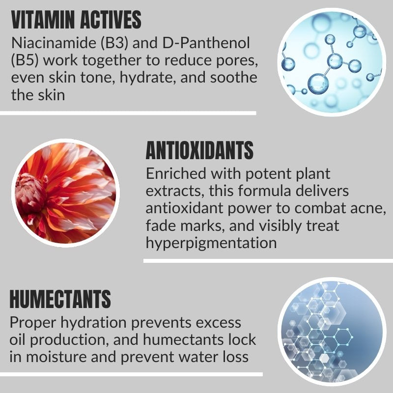 Vitamin B3 & B5 - Niacinamide (B3) helps visibly reduce enlarged pores and improve uneven skin tone, while D-panthenol (B5) hydrates and reduces skin sensitivity.